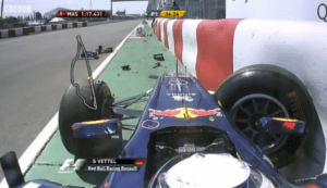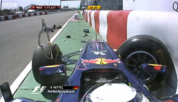 - Red Bull:Webber had a somewhat underwhelming start but soon wound up the pace. However big news was Vettel’s lack of time on the track, an installation lap uncovered a brake problem, but once that was fixed he lamped the car into the Wall of Champions. Taking it all a bit too literally. “I hit the kerb, slid off the track and hit the wall. I’m fine.” Webber fans need not worry there is a spare front wing to hand, and no it’s not on Webber’s car.