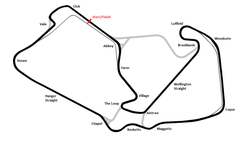 This year we’re starting on the straight heading towards Abbey, but instead of a left turn into Bridge and Priory, we’re going right towards the sweeping left curve into Farm. Next up is the new area built for the spectators, Village corner, a tight right turn designed to help with overtaking in conjunction with The Loop. Aintree’s left turn will be taken flat out, considered more of a kink than a corner before the new Wellington Straight (DRS zone). Now we’re back to something more familiar, they’ll sweep through Brooklands before heading into the long Luffield right-handed hairpin. The old final corner of Woodcote remains a fast right turn feeding into the former start/finish straight. Now here comes the history, the brave, full of downforce and in the dry will take Copse flat out, a breath is taken as they head into the classic combination of Maggots, Becketts and Chapel (right, left, right). The Hanger Straight leads the procession into the fast right turn of Stowe, two right hand turns later take you past Club and towards the finish line.