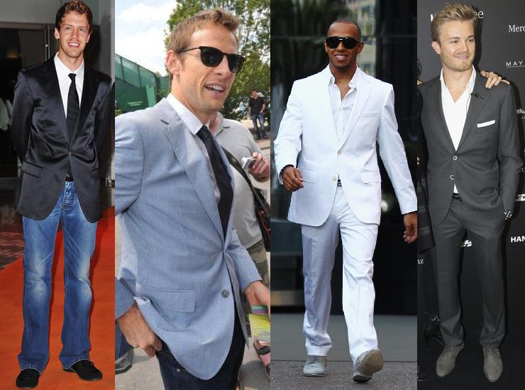 Once a year several handpicked drivers are paraded around the Monaco Amber Lounge in their finery, however this doesn’t count as they’ve had the help of a stylist. Team orders may be allowed on track, but they’re banned here and drivers have to make their own choices. Being formal isn’t all about tuxedos however, if you’re young you might want to be a bit daring, but you’ve got to do it right. Take Vettel and Button mixing it up, don’t do ill-fitting jeans and a shiny jacket, do powder blue and dark denim. Instead of looking like a reality TV star on their first red carpet, you can look rather dapper. Hamilton and Rosberg are keeping it simple by going monotone, but you can only wear white trousers on their own, as going all out pushes the boyband vibe. The trick with monotone is to use another colour…case and point Mr Rosberg.