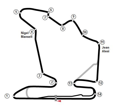 The driver heads towards the first corner, they drop down into a 180º right hander and hit the power as they exit. Past the right handed kink they head into a slow left 180º back on themselves, then sweeping through turn 3 they will get on the power to head up a short straight towards turn 4 and a combination of tricky corners. The Nigel Mansell corner is taken with a light touch on the brakes, but is a fast left hander that shoots the drivers towards the furthest point of the track. Climbing uphill towards turn 5, they launch into the long, bumpy right hander, pushing on through another short straight they arrive at the turn 6/7 right-left chicane. Next up is the medium speed turn 8 which leads into the right of turn 9, and the drivers should stay on the gas for the left kink of turn 10. Gentle on the brakes for turn 11 (Jean Alesi) opens up the track onto the second longest straight before they hit the 90º right turn of 12. Turn 13 is slow left hairpin which takes to the drivers into the final turn of 14, a right handed 180º, and then they are back onto the start/finish straight.