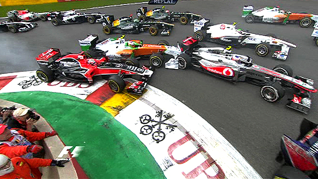 This isn’t a hard one as Bruno Senna went and admitted it. He puts the collision with Jaime Alguersuari at Le Source after the start down to a lack of experience and running in a heavy fuelled car. All practice sessions were disrupted by rain, so he first taste of life in the dry in the Renault was on race day. Senna explained, “I didn’t do the first corner with high fuel, ever, and unfortunately I misjudged the braking area. There was no way for me to avoid Jaime and I am really sorry about his race.”