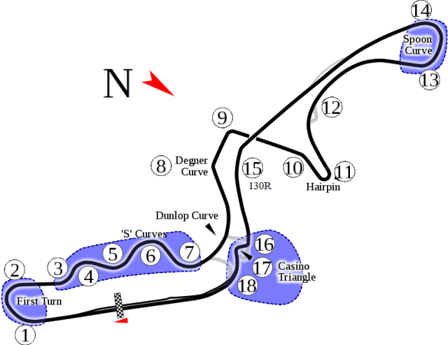 The start/finish straight allows the drivers to hit speeds of 250km/h+ before braking late into the fast sweeping right of turn 1 which leads quickly into turn 2. The exit must be executed right to provide the best line into the ‘Esses’ (‘S’ Curves) of turns 3/4/5, being bumpy the brakes are seldom used so aero is relied upon. Turn 6 is tighter and turn 7 is bumpy, long corner that feeds into the Dunlop Curve. Turn 8 (Denger Curve) is one of the many fast corners that feature around Suzuka, a softer set up can ride the kerbs, but it’s the exit that matters as the make the short dash to turn 9. Using the camber in the middle of the corner to help them out, they race underneath the track passing overhead. Heading towards the turn 11 hairpin, turn 10 is a right handed kink, the hairpin is the slowest corner out there and require concentration and commitment.