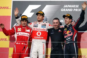 So it may not have been a nail biter, but it lifted the lid on what we could be privy to in the last four races of the season. Ferrari and McLaren could push the constructors’ title further than anticipated, though who could see it going anywhere else but Red Bull? It would be richly deserved by a team who have yet to put a foot truly wrong with strategy and design this season, they have known exactly what to do to get the right result all year. But did you see Vettel struggle a wee bit in traffic? He was clearly annoyed by being launched into traffic after a pit stop, something he’s rarely experienced in 2011 and something non-Vettelian fans will probably want to see happen more often. The grandstands were packed from Thursday onwards, and presented the drivers with voracious admiration and adulation as they brought the media to Japan to witness a positive global event. Even Bernie Ecclestone got in on the goodwill by getting puppets manufactured with profits going to charity, and giving tickets away to tsunami victims. Also worth noting is that Schumacher led a lap! Petrov did his best to retain his seat for 2012, and Perez had a quiet yet productive day. Rosberg also did well despite a last row start, and got himself into the points.