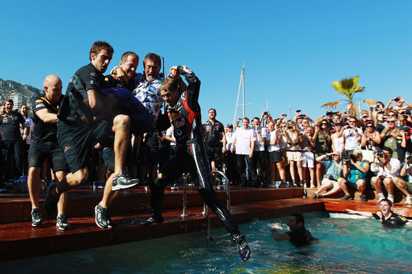 Ah Monaco. The glitz and glamour was already in doubt when Geri Halliwell compared Vettel to a well known bottled water brand, but it got washed away when Mark Webber dunked Humphrey in the Red Bull motorhome pool. But that wasn’t enough, we wanted the rest of the team to take a dip too. DC (wearing white trousers surprisingly) squealed and held onto the rails like a little girl but was no match to the mighty mighty Red Bull lads. EJ also fell foul of an obvious ploy, Humphrey sent him in search of Vettel but instead got a taste of the wet stuff. It’s your turn next year Brundle…