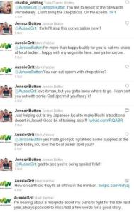 Needless to say there are a few words necessary here. It’s @AussieGrit and @JensonButton talking about eating cod sperm with chopsticks, what do you say? Well, according to the pair you bring up the topic again.